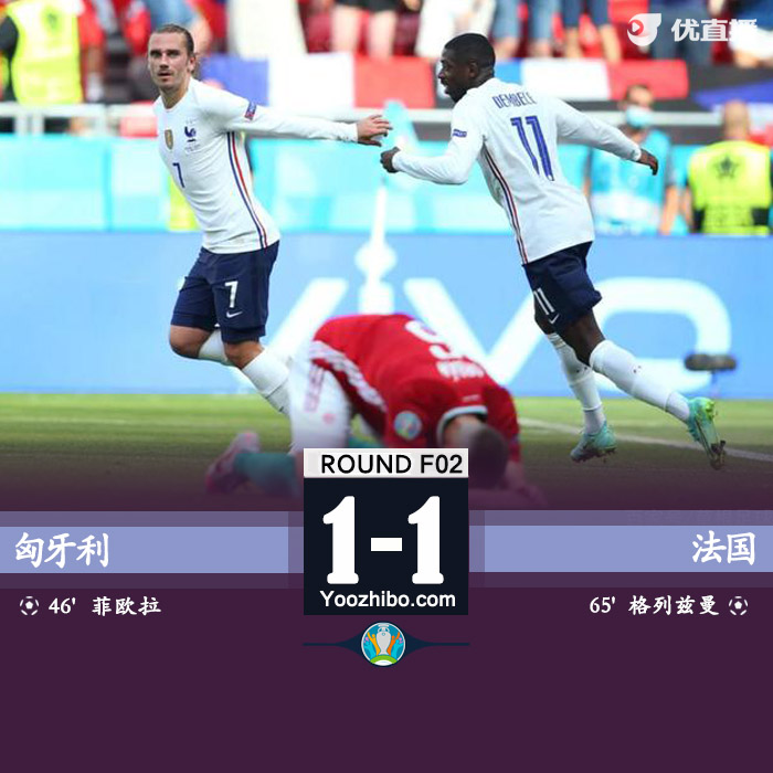 法国1-1匈牙利 菲欧拉破门格列兹曼扳平登贝莱替补伤退