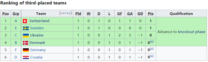 德国和匈牙利均没有拿到积分,因净胜球关系分列三四位。本届欧洲杯成绩最好的四支小组第三球队将晋级16强,德国目前排在第5,若想要晋级淘汰赛,他们需要确保未来两场比赛万无一失。