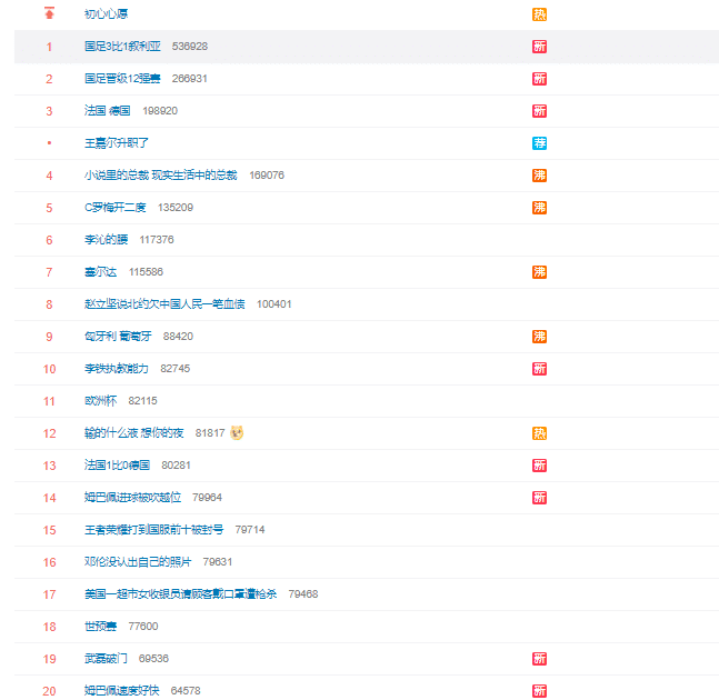 这样我们就看到了很“罕见”的一幕,那就是足球统治了热搜榜,在热搜榜的前20名占据超过一半,其中国足击败叙利亚和晋级12强赛的相关话题稳居前列,热度要比欧洲杯赛场上德国队0-1不敌法国队和C罗梅开二度带领葡萄牙队获胜的热度高。