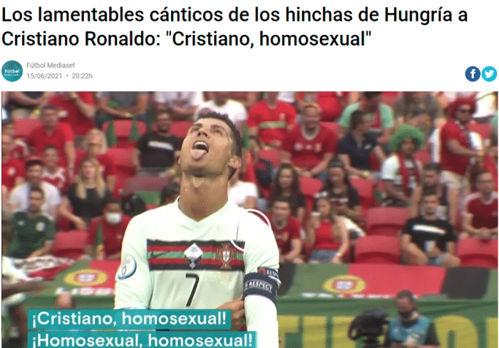 24直播网讯据西班牙媒体Telecinco报道,在葡萄牙对阵匈牙利的比赛期间,部分匈牙利球迷曾唱歌辱骂C罗是同性恋。