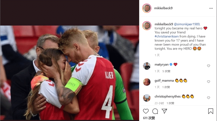 24直播网讯 北京时间6月13日,丹麦在欧洲杯小组赛首轮0-1不敌芬兰,埃里克森在上半场比赛第43分钟无接触倒地,队长克亚尔第一时间为其做心肺复苏,并在医生到来后安慰埃里克森慌乱的妻子。