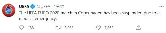 欧足联官方消息,由于比赛中出现紧急情况,丹麦vs芬兰比赛暂停。