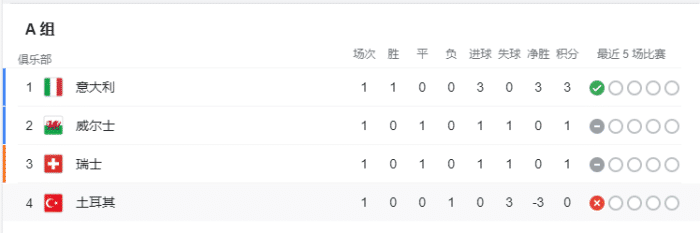 A组方面,意大利在首战中3-0战胜土耳其,积3分排名小组第一。握手言和的威尔士和瑞士则并列第二,输球的土耳其0分垫底。