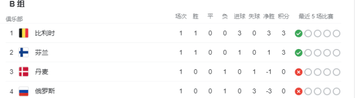 至于B组,比利时赢球积3分和3个净胜球排小组头名,芬兰3分1个净胜球排名第二,丹麦0分-1个净胜球第三,俄罗斯0分-3个净胜球第四。