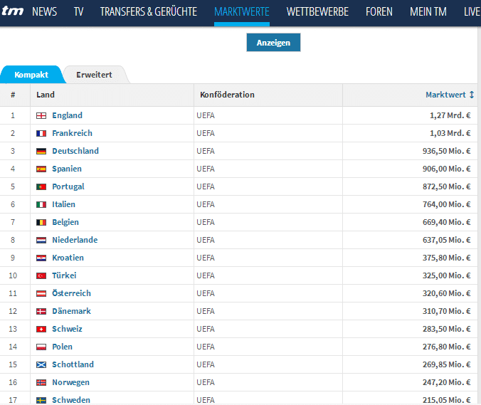 24直播网讯 欧洲杯的比赛即将开始了,许多球迷都开始关注欧洲杯的比赛了。那么,本届欧洲杯比赛中,各大球队的身价如何呢?今天小编就查了一下德转给出的身价,其中参加欧洲杯的球队中,英格兰国家队的身价最高,高达12.7亿欧元,而排名第二的法国国家队则只有10.3亿欧元,第三的是德国队,他们的身价只有9.365亿欧元,好了话不多说一起看排名。