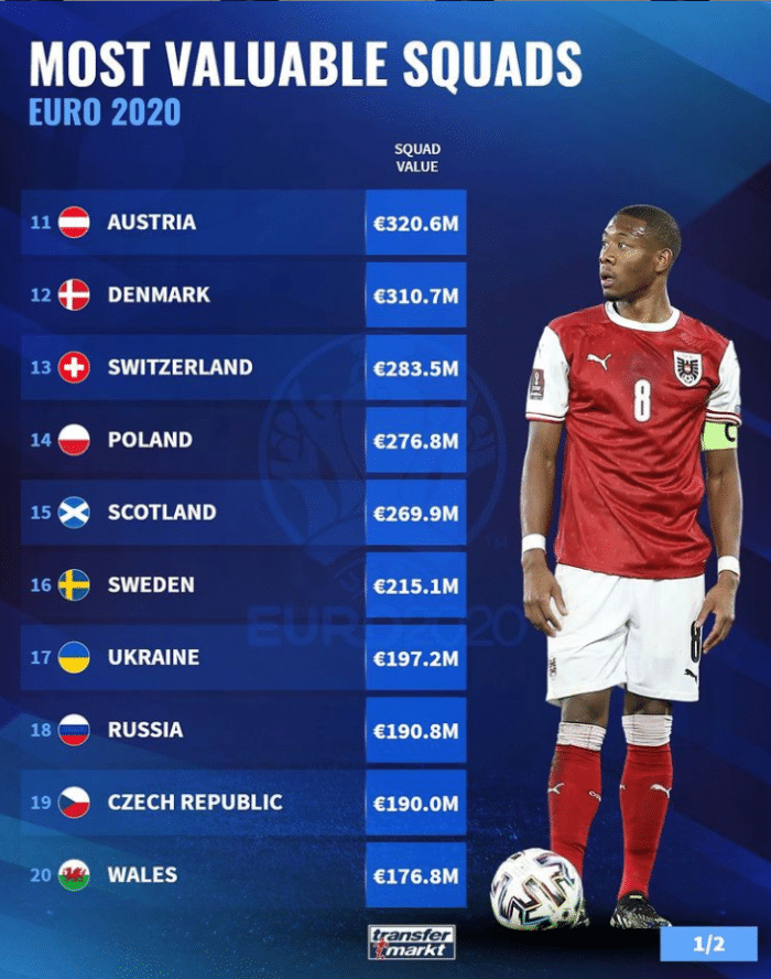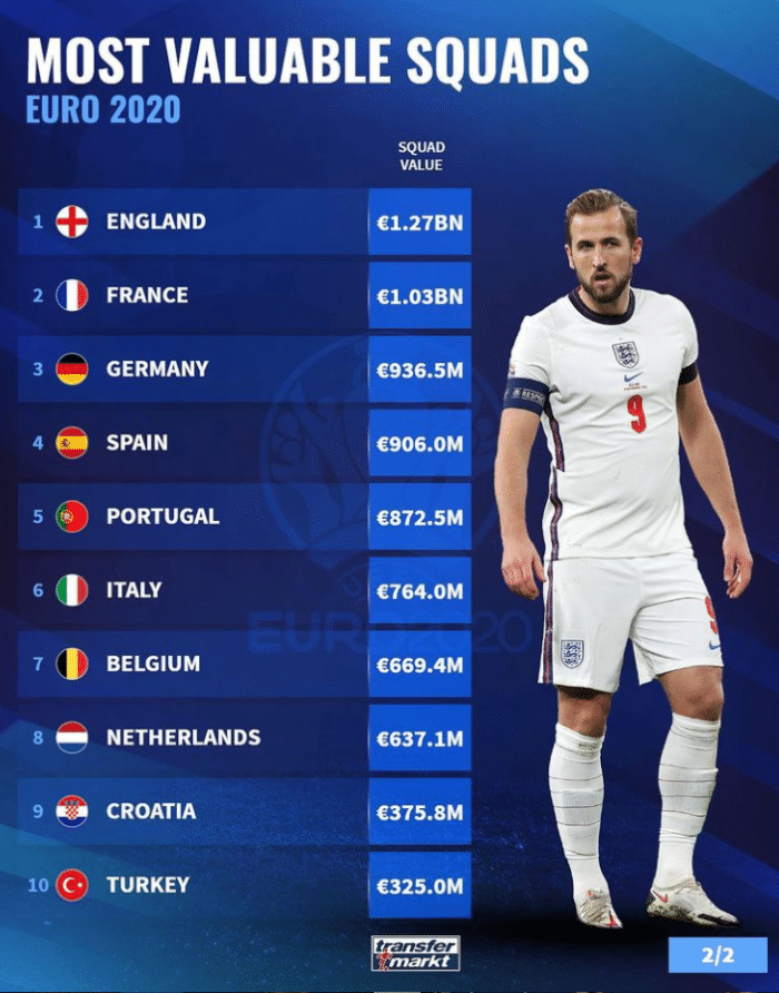 24直播网讯德国转会市场今日盘点了欧洲杯参赛球队的身价,英格兰以12.7亿欧元位居第一,法国和德国则紧随其后。