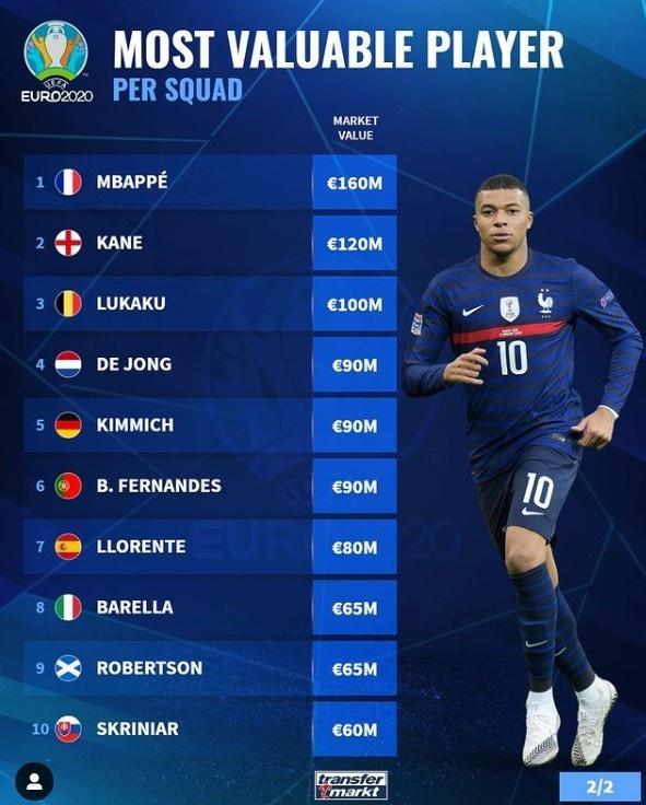 24直播网讯 欧洲杯即将战火重燃,《德国转会市场》也统计了各队身价最高的球员,姆巴佩以1.6亿欧领跑法国。