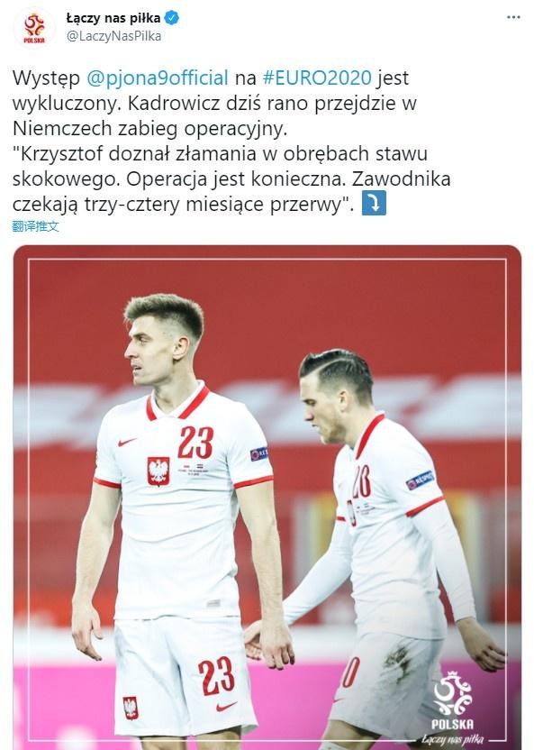 24直播网讯北京时间5月14日,波兰足协官方确认,前锋皮扬特克今天上午在德国接受了手术,将伤缺三到四个月,无缘下个月的欧洲杯。