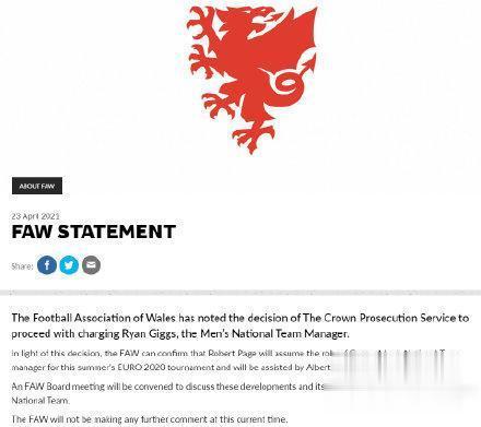 如今,英国皇家监控署正在调查吉格斯被指控对两名女士实施暴力行为的案件,威尔士足协获悉吉格斯已被起诉,决定罗伯特-佩奇将在今夏的欧洲杯中接过主帅一职,阿尔伯特-斯图文伯格担任助教。威尔士国家队将会对此事展开会议并进一步讨论。