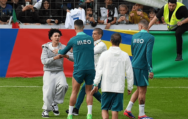 由于怕这些球迷对C罗造成某些意外伤害,葡萄牙国门若泽-萨勇敢冲向这些疯狂球迷,将他们放倒在地,帮助C罗缓解了尴尬。