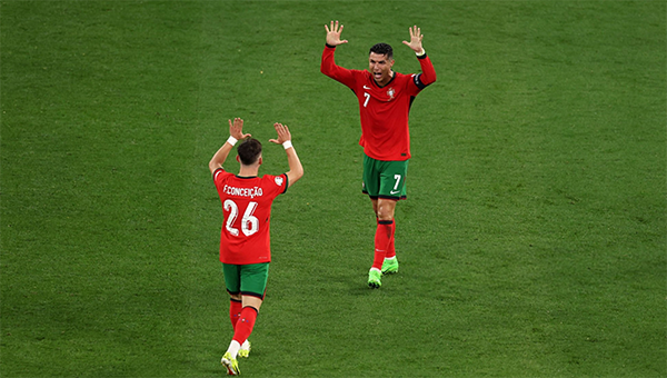 24直播网讯 本届欧洲杯第一个伤停补时绝杀来袭,在欧洲杯小组赛F组第1轮,葡萄牙队以2比1逆转击败捷克队,拒绝爆冷。这场比赛C罗首发登场,个人第6次征战欧洲杯、第26次欧洲杯出场,均创造新历史。期间,葡萄牙队的主帅马丁内斯上演神换人,内托和孔塞桑登场,在第92分钟,内托传球,孔塞桑破门绝杀,为球队带来胜利。