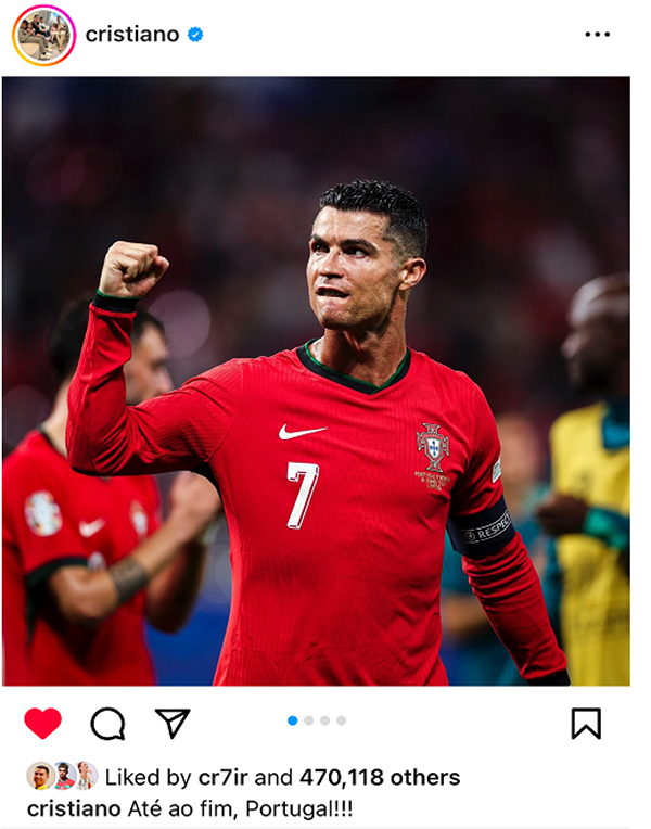 比赛结束之后,C罗首度发声,他在社交媒体上鼓舞全队,称不到结束永不言弃!葡萄牙加油。