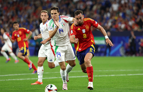 首轮比赛,西班牙与意大利都拿到胜利。本场比赛,双方谁取胜就将提前出线。上半场,西班牙进攻占据优势,但意大利防守非常顽强,门神多纳鲁马更是多次作出关键扑救力保球门不失。