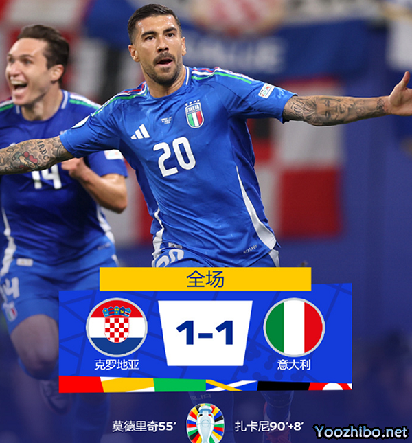 24直播网讯 意大利队能够晋级淘汰赛,是非常戏剧性的,在和克罗地亚的比赛第97分钟之前,0-1落后的他们都是处于被动的一方,因为这样的结果会让他们的排名跌至小组第三,只能去等待晋级的结果,出局的可能性很大。好在第98分钟,意大利队的扎卡尼打进绝平球,强势扳平比分,1-1的比分也让意大利队排名小组第二,直接晋级淘汰赛,挺进16强。