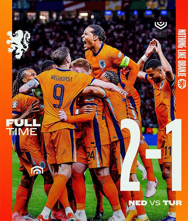 24直播网讯 在北京时间7月7日凌晨结束的欧洲杯最后1场1/4决赛中,老牌豪门荷兰2-1惊险逆转大黑马土耳其,晋级半决赛,这也是荷兰时隔20年后再次跻身欧洲杯4强。以小组第3出线的“橙衣军团”,终于没有浪费这次绝佳的签运。