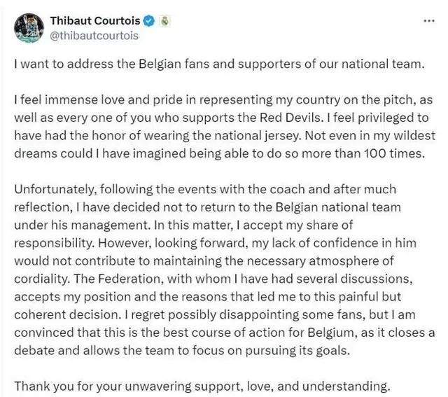 不幸的是,在与教练发生冲突并经过深思熟虑后,我决定不再回到特德斯科执教的比利时国家队。在这件事上,我承担了自己的责任。然而展望未来,我对特德斯科的不信任不利于队内的友好氛围。我曾与比利时足协进行过多次讨论,足协接受了我的立场以及促使我做出这一痛苦但明智决定的理由。我很遗憾这可能会让一些球迷失望,但我相信这对比利时来说是最好的行动方案,因为它结束了争议,让球队可以专注于追求自己的目标。