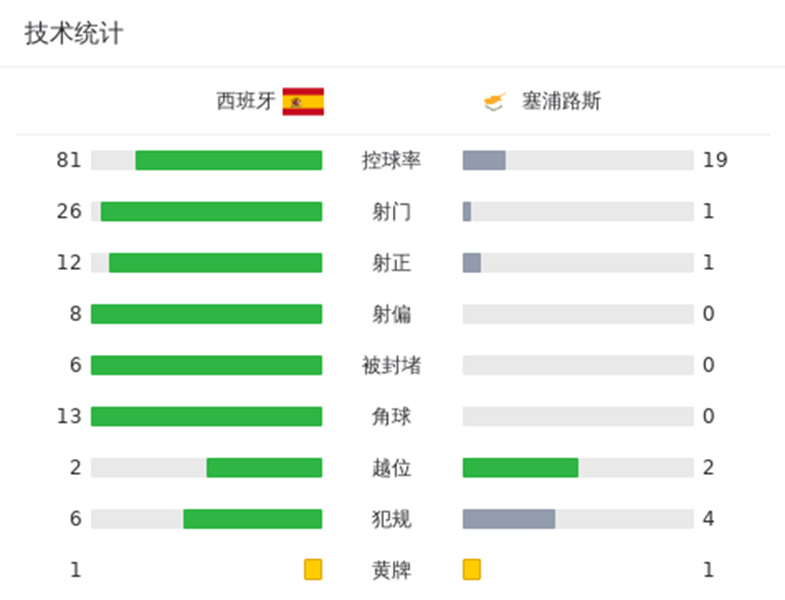 全场比赛结束,最终西班牙6-0塞浦路斯。