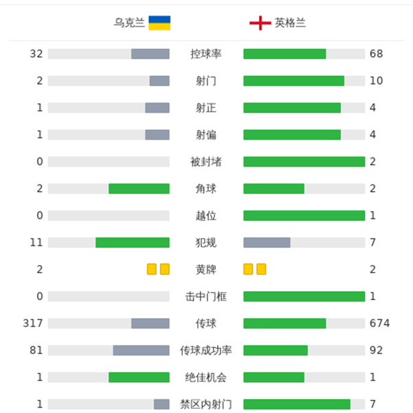 双方出场阵容: 英格兰:1-皮克福德、2-沃克、3-奇尔维尔、5-格伊、6-马奎尔、4-赖斯、8-亨德森、10-贝林厄姆(65' 20-福登)、11-麦迪逊(65' 19-拉什福德)、7-萨卡(86' 21-加拉格尔)、9-凯恩 未出场替补:13-约翰斯通、22-拉姆斯代尔、12-特里皮尔、14-科尔维尔、15-托莫里、16-凯文-菲利普斯、17-邓克、18-艾泽、23-卡勒姆-威尔逊 乌克兰:1-布什坎、16-米科伦科、22-马特维延科(46' 4-克里夫索夫)、13-扎巴尼、2-科诺普利亚、6-斯特帕宁科、17-津琴科(76' 14-布亚尔斯基)、8-苏达科夫(65' 5-瑟多尔丘克)、10-穆德里克(90' 20-纳扎里纳)、9-雅列姆丘克(65' 11-多夫比克)、15-齐甘科夫 未出场替补:12-特鲁宾、23-卢宁、3-米哈伊琴科、7-亚尔莫连科、18-瓦纳特、19-波波夫、21-卡拉瓦耶夫
