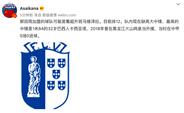 24直播网01月27日讯 据《体坛周报》记者王晓瑞、媒体人白国华等消息源报道,郭田雨将在下个月租借加盟葡超球队维泽拉,租期半年。