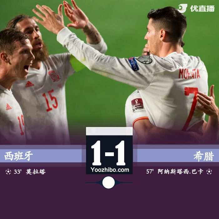 24直播网3月26日讯 北京时间03月26日星期五03:45,世预赛欧洲区B组西班牙对阵希腊世界杯预选赛打响。上半场,科克助攻莫拉塔首开记录,半场西班牙1-0领先希腊。下半场,马丁内斯替补登场被判罚黄点套餐,巴卡斯塔斯点射扳平。最终,西班牙1-1战平希腊,双方各取1分。