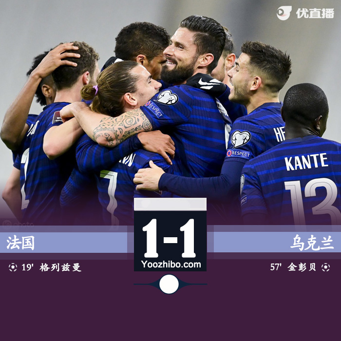 24直播网3月25日讯 北京时间3月25日03:45,世界杯欧洲区预选赛D组首轮展开争夺,法国迎战乌克兰。上半场,格列兹曼世界波帮法国取得领先。下半场,西多丘克射门造成金彭贝乌龙帮乌克兰扳平比分。最终,法国1-1打平乌克兰,两队各取1分。