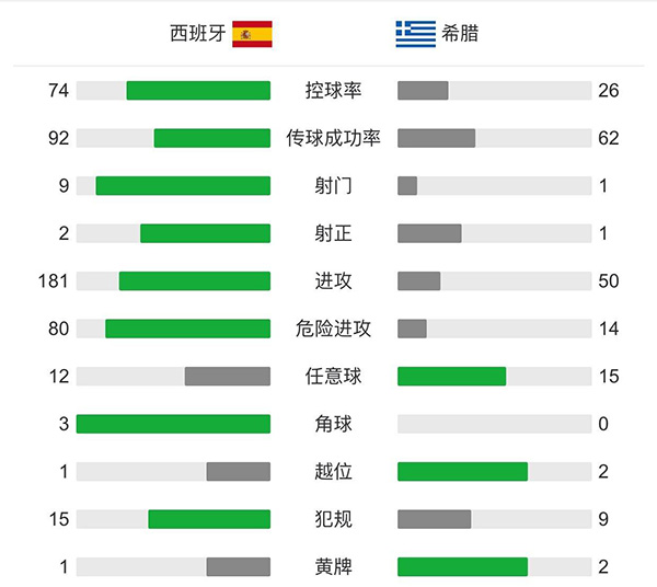 24直播网讯:北京时间3月26日3:45,2022年世界杯欧洲区预选赛B组第1轮,西班牙主场迎战希腊。上半场,奥尔莫头球攻门顶高,科克射门被封堵,奥尔莫远射中框,科克助攻莫拉塔破门。下半场,伊尼戈-马丁内斯送点,巴卡西塔斯点射扳平,最终,西班牙1-1希腊。