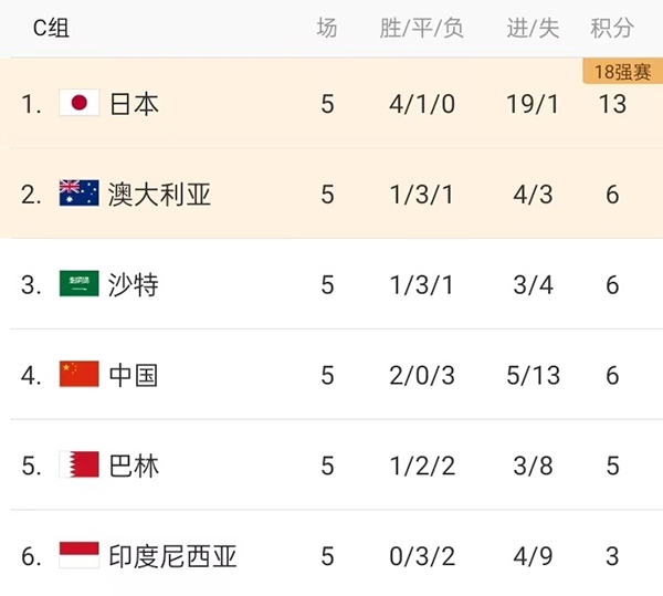 5轮战罢,C组的积分榜也显得十分有看点。日本队在本组”一枝独秀“,5轮4胜1平积13分,领跑优势多达7分。而日本身后,其他5队则陷入乱战。