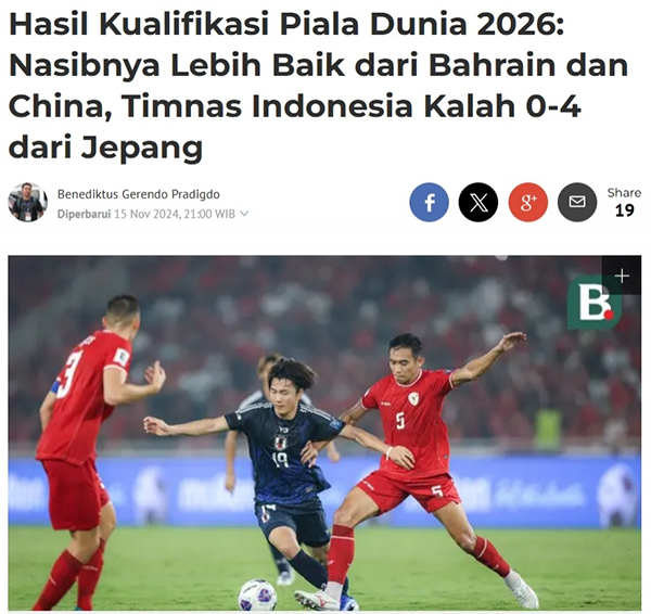 当然也有清醒的印尼媒体,FOKUSSATU就悲观评价道:“0-4意味着印尼队仍然只有3个积分,且净胜球只有-5。对于印尼队来说,想获得2026世界杯参赛资格将面临非常艰难的争夺。印尼队将在11月19日在同一片主场再次出战沙特,如果他们再度输球,印尼队的晋级希望就将破灭。”