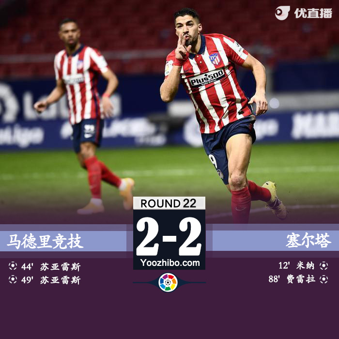 24直播网2月9日讯 北京时间2月9日04:00,西甲第22轮继续进行,马德里竞技主场迎战塞尔塔。上半场,米纳冲顶帮塞尔塔取得领先,M-略伦特助攻苏亚雷斯铲射扳平比分。下半场,洛迪助攻苏亚雷斯再入一球反超比分,法昆多-费雷拉打入绝平进球。最终,马德里竞技2-2战平塞尔塔,八连胜遭终结,8分优势继续领跑积分榜。