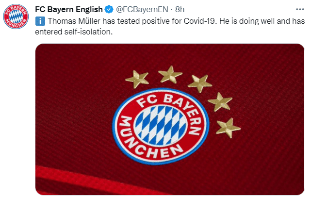 拜仁公告写道:“穆勒新冠检测呈阳性,球员目前状况良好,正在按规定接受隔离。”