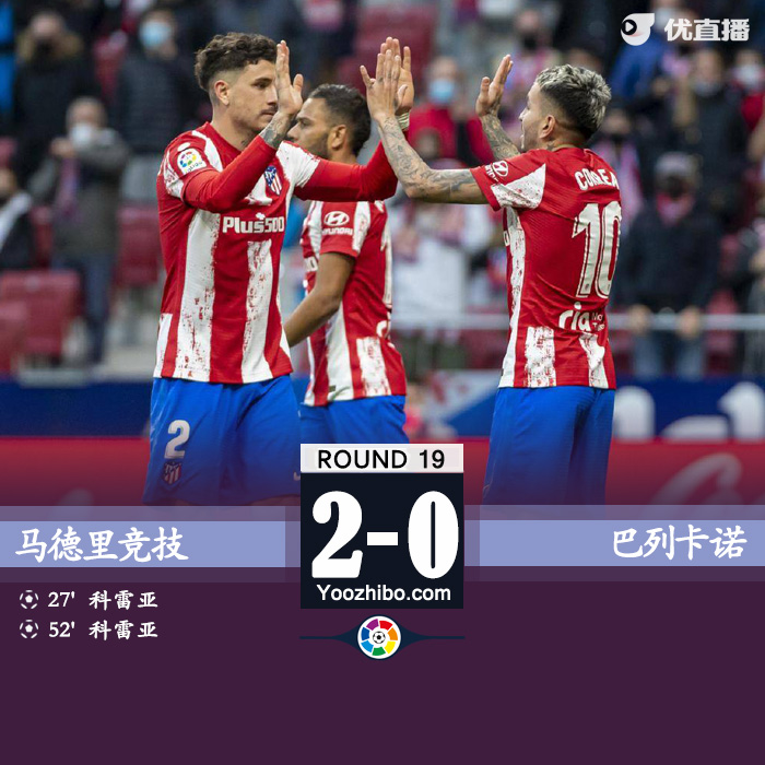 24直播网1月2日讯 北京时间1月2日23:15,西甲联赛第19轮,马竞主场迎战巴列卡诺的比赛,上半场科雷亚补射破门,下半场科雷亚完成梅开二度,最终,马竞2-0巴列卡诺。