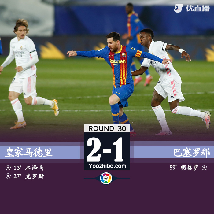 24直播网4月11日讯 北京时间4月11日凌晨3点整,2020-21赛季西甲第30轮国家德比在迪斯蒂法诺球场展开角逐,皇家马德里坐镇主场迎战巴塞罗那。上半场本泽马脚后跟破门,克罗斯任意球扩大比分,巴斯克斯伤退,梅西角球中柱。下半场明格萨扳回一城,卡塞米罗染红,莫里巴终场前中框。最终皇家马德里主场2-1战胜巴塞罗那,皇马本赛季双杀巴萨,巴萨19轮不败遭终结。积分榜方面,皇马积66分暂时升至榜首,巴萨积65分下滑至第3名。