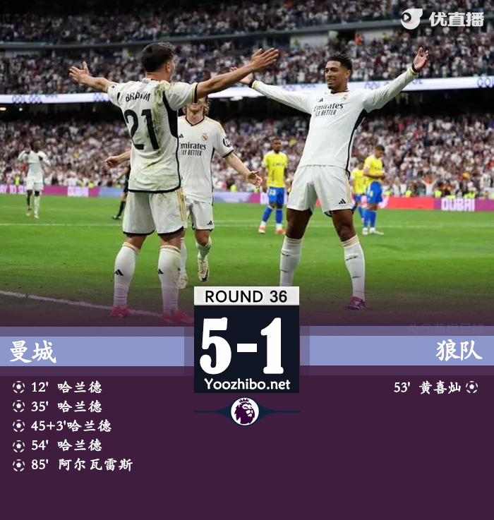 24直播网讯:北京时间5月5日,英超第36轮,曼城主场迎战狼队。上半场,哈兰德点射双响+头槌破门上演帽子戏法。易边再战,黄喜灿扳回一城,哈兰德大四喜,阿尔瓦雷斯替补建功。最终曼城5-1狼队。积分榜方面,曼城少赛1场落后阿森纳1分,狼队46分第11。