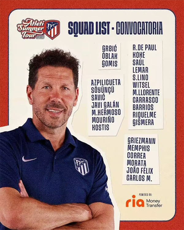 24直播网讯 北京时间7月27日晚19时,马竞将在韩国和K联赛全明星队踢一场夏季热身赛。马竞俱乐部在官方推特公布了此次韩国之行的大名单,可能会在今夏转会离队的莫拉塔和菲利克斯都被召入名单。
