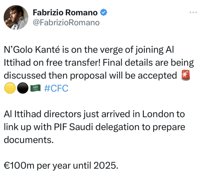 24直播网06月07日凌晨,来自知名转会专家罗马诺和记者Matteo Moretto的最新消息,效力于切尔西的后腰坎特,即将自由转会加盟沙特联赛冠军吉达联合,俱乐部希望在48小时内正式敲定。