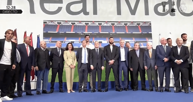 告别仪式开始之前,现场人员起立,给本泽马送上掌声,随后现场播放本泽马在皇马的高光时刻。