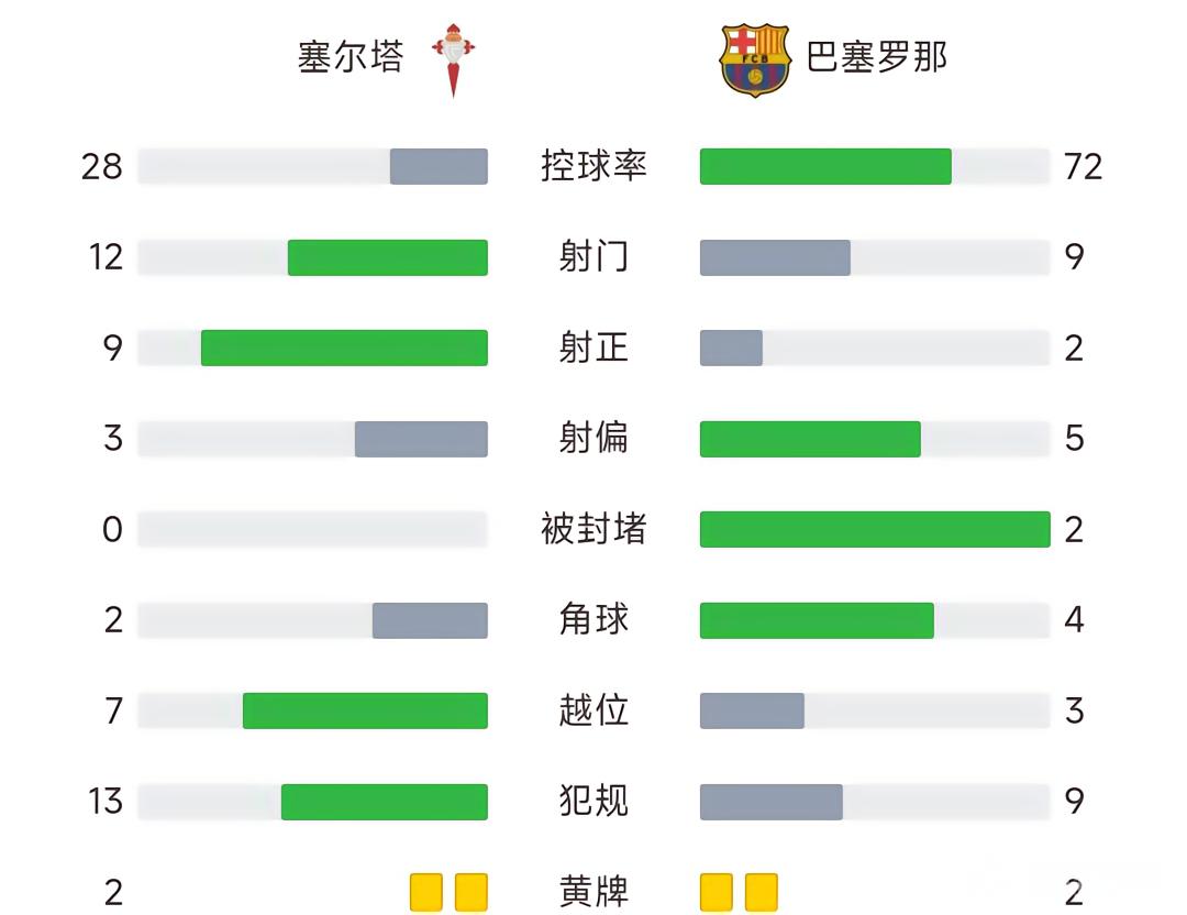关键事件: 第42分钟,塞尔塔打破僵局!塞费罗维奇弧顶斜传维加禁区右路推射远角破门,塞尔塔1-0巴萨。