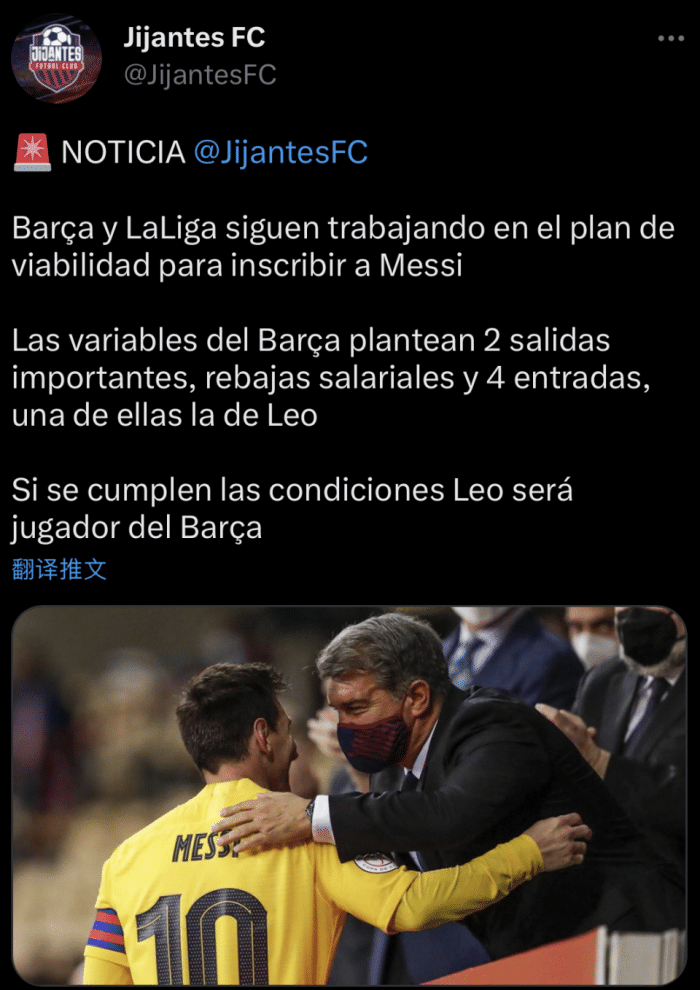 此前,西甲联盟主席特瓦斯已经明确表示,他不会给巴萨签回梅西开绿灯。他不会触及“公平竞争”的规则,来给予巴萨优惠待遇,但他也认为这桩转会是可行的。毕竟在世界杯夺冠后,梅西的巨大商业价值再次得到印证。西甲联盟也乐于看见,这位超级巨星能重返西甲踢球。