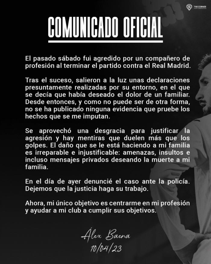 巴埃纳写道:”上周六(西班牙当地时间)我在对阵皇马赛后被一位同行袭击了。在事件发生后,有一些可能是从他(巴尔韦德)的阵营流出的说法,说我诅咒他家里人。此后,对于加到我头上的这些事,没有人拿得出任何的证据,除此之外不会有别的可能的。”