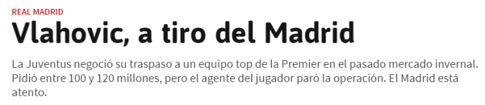 24直播网02月2日讯 据西班牙媒体《阿斯报》报道,皇马可能在今夏签下尤文的塞尔维亚中锋弗拉霍维奇。