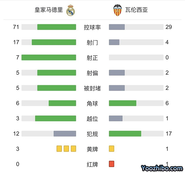 全场比赛结束,最终皇马2-0十人瓦伦西亚。