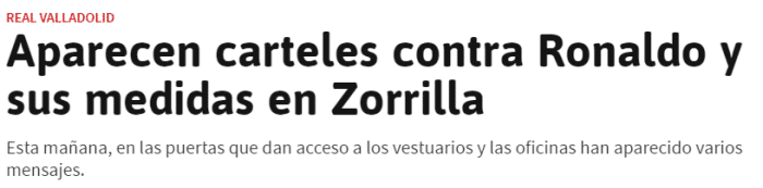 此举引发巴拉多利德球迷不满,他们拉横幅表达不满,横幅上写道:罗纳尔多在捍卫皇马的利益,而不是巴拉多利德。