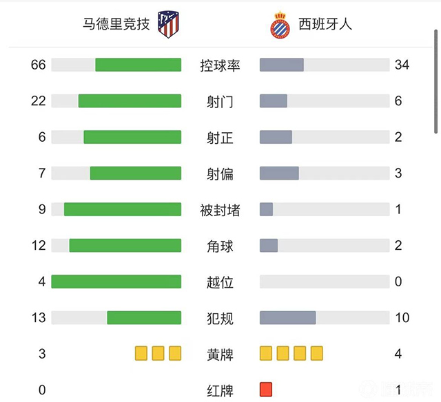 第79分钟,菲利克斯禁区左路接长传一脚低射扳平比分,马德里竞技1-1西班牙人。