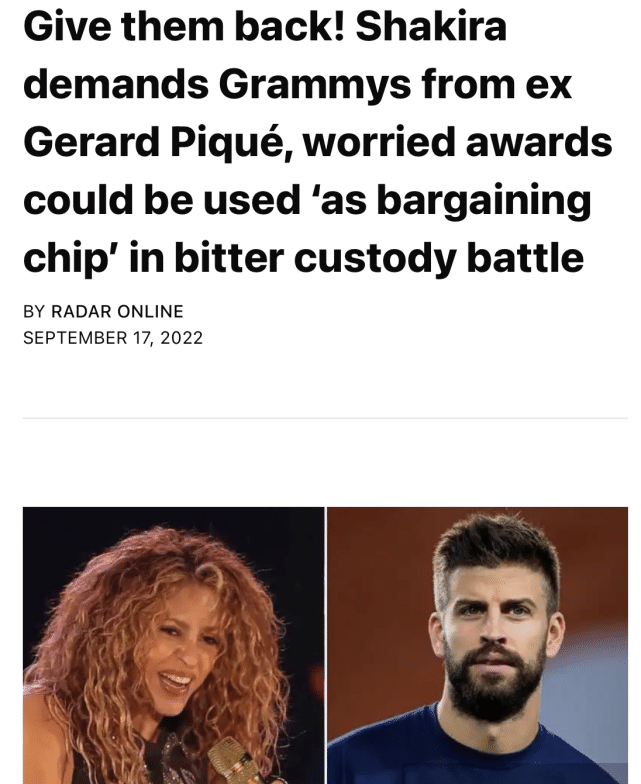 因为尽管夏奇拉希望皮克能将她的格莱美奖杯还给她,但巴萨队长却并不打算答应夏姐的要求,西媒La Razon表示,两人还在就分手后的财产分配和孩子抚养权对簿公堂,皮克可能会以此作为交换抚养权的筹码。