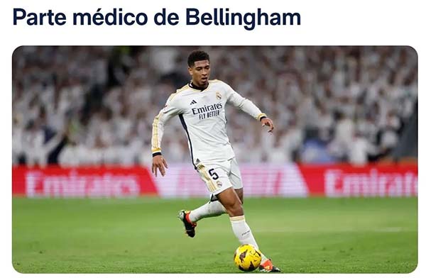 据记者Javier Birlanga透露,贝林厄姆将伤缺约4周。