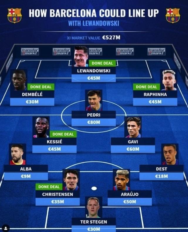 24直播网07月17日讯 凌晨,巴萨官方宣布与拜仁就莱万多夫斯基的转会达成了协议。待球员通过体检并且签约完成后,就将正式加盟。而在莱万正式成为巴萨球员后,德国《转会市场》也列出了巴萨新赛季的4-3-3首发强阵,而这11人身价总额高达4.47亿欧元。