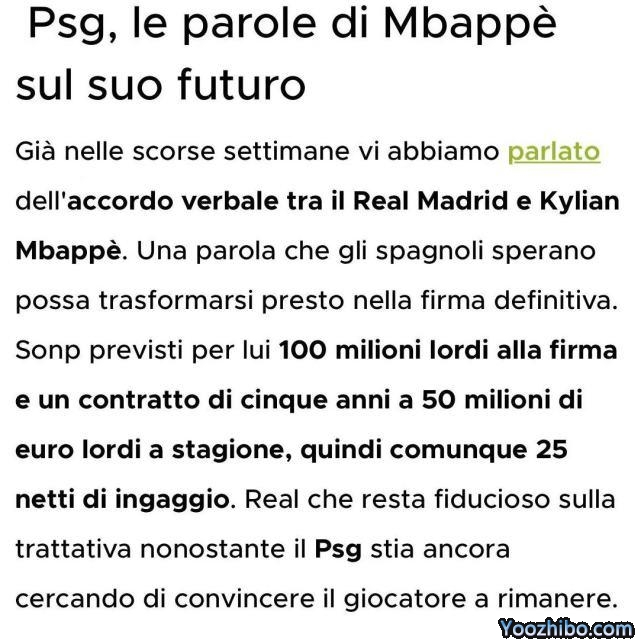 而来自知名转会专家迪马济奥的最新消息,姆巴佩最终还是选择离开大巴黎,接受皇马的邀请。双方很快就会签下最终合同。迪马济奥透露,姆巴佩预计将获得1亿欧元作为签字费和一份5年合同,每个赛季的总收入为5000万欧元,净额为2500万欧。