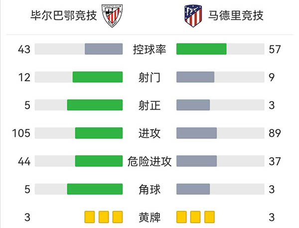 全场比赛结束,毕尔巴鄂2-0马竞。