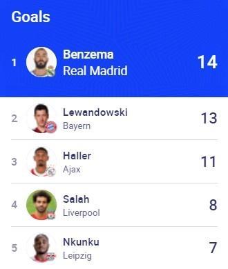 本泽马本赛季在欧冠联赛中已打入14球,超过莱万多夫斯基排名第一。目前仍有(微弱)希望追上他的只有8球的萨拉赫,6球的丹朱马以及6球的马赫雷斯。