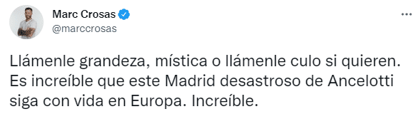 24直播网04月27日讯 消息,前巴塞罗那球员马克-克罗萨斯发推称,这支灾难性的皇马在欧冠还活着令人惊讶。